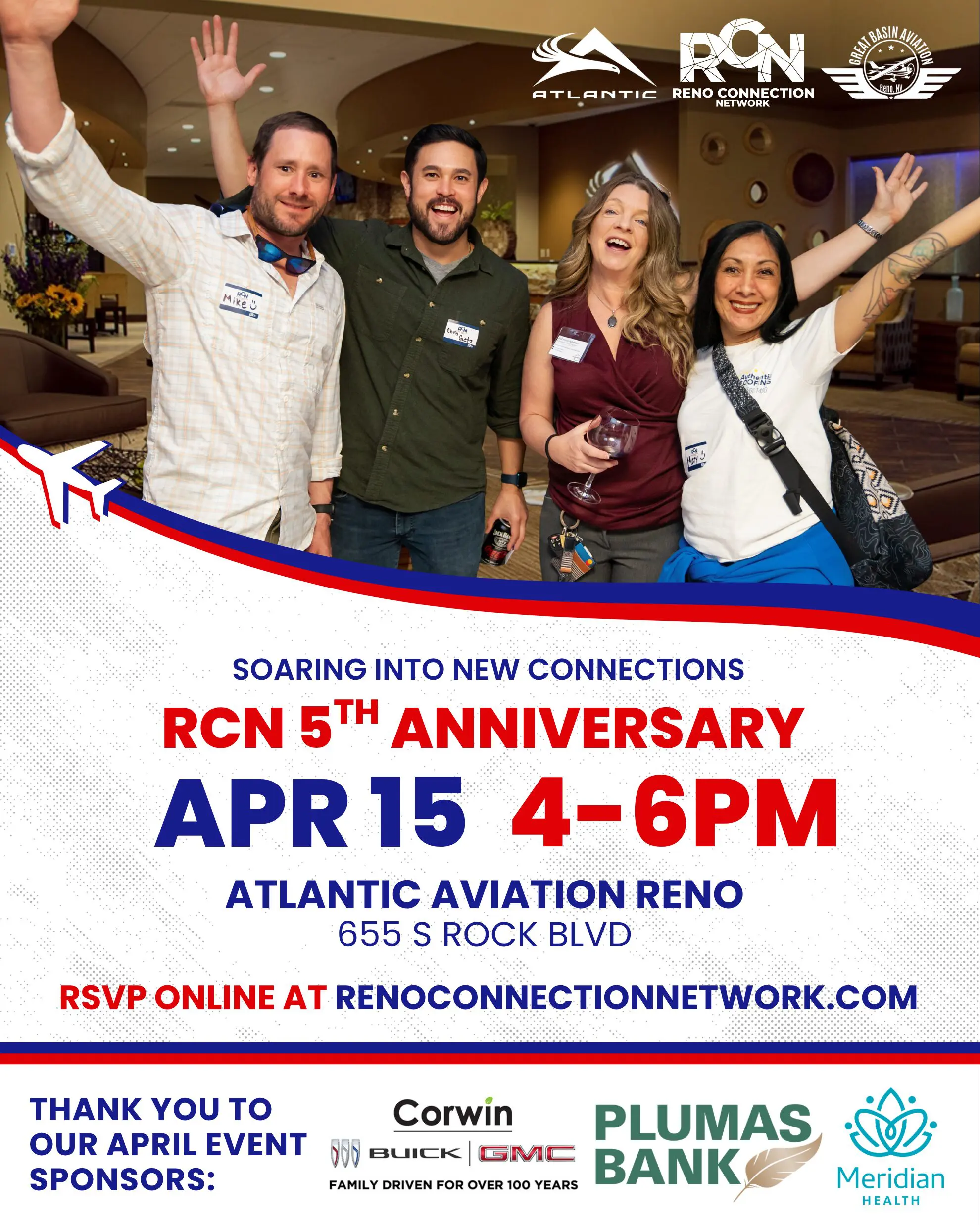 Let’s celebrate five incredible years of connections, conversations, and community with the Reno Connection Network this April! Join us at Atlantic Aviation Reno, located at 655 S Rock Blvd, for a special 5th Anniversary event bringing together professionals from across Northern Nevada for an evening of energy, engagement, and meaningful connection. Whether you’ve been part of the journey since the beginning or are joining us for the first time, this milestone celebration is your chance to be part of something truly special.