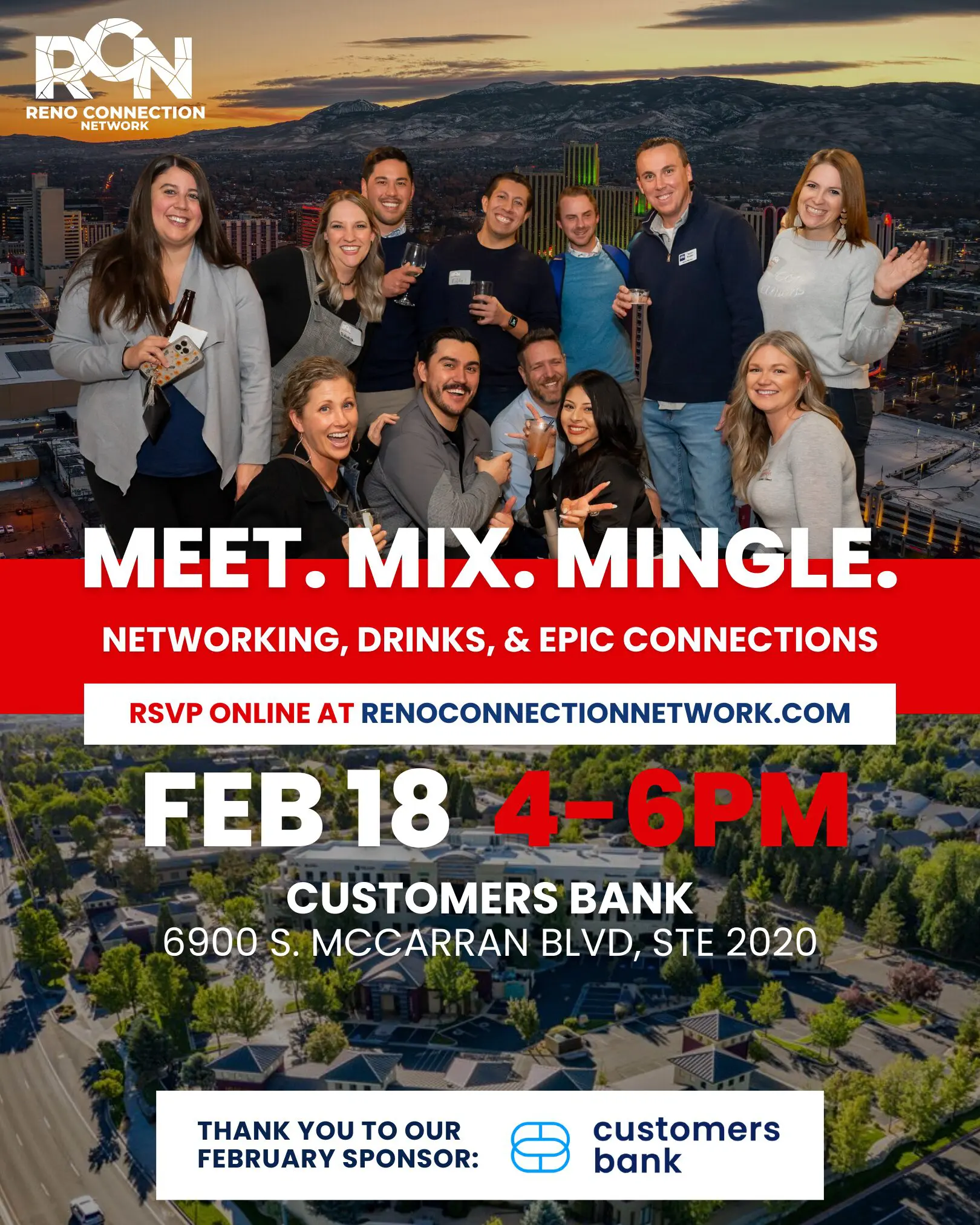 Let’s kick off the new year with fresh connections and great conversations! Join us this February 18th at Customers Bank, 6900 S. McCarran Blvd, Suite 2020, where professionals come together to connect and collaborate. Special thanks to our Host and Sponsor, Customers Bank, for helping make this event possible. Whether you’re meeting new contacts or catching up with familiar faces, this is your chance to connect with Reno’s thriving business community.