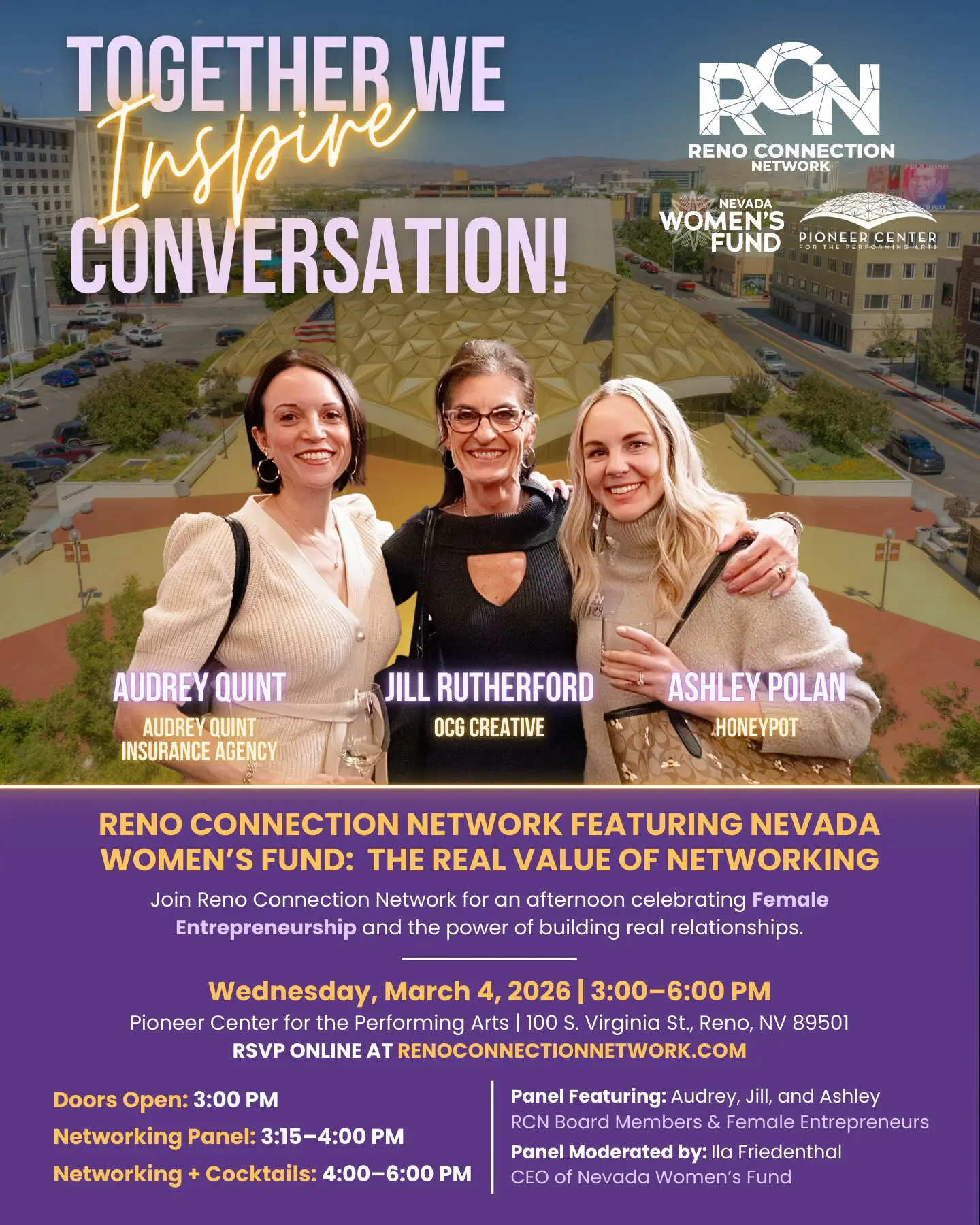Celebrate Women’s History Month with the Reno Connection Network at our March Networking Event, sponsored by the Nevada Women’s Fund. Join fellow professionals on March 4 at the Pioneer Center For the Performing Arts, located at 100 S. Virginia St., Reno, NV for an engaging evening of networking and conversation, featuring a dynamic panel discussion on the true impact of building meaningful relationships moderated by Ila Friedenthal, CEO of Nevada Women's Fund from 3PM-4PM and open networking & cocktails 4PM-6PM.