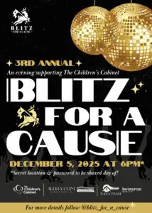 Let’s come together for a night of celebration, community, and giving back! Join us on Friday, December 5, 2025, at 6:00 PM for the 3rd Annual Blitz for a Cause, a pop-up speakeasy fundraiser benefiting The Children’s Cabinet, an organization that provides more than 40 free programs supporting local youth and families.